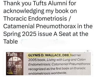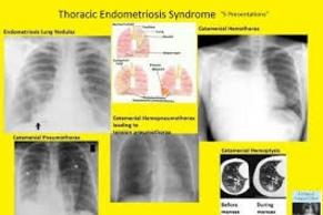 Catamenial Pneumothorax was previously an under- recognized disease. Cata·meni·al - of or relating to menstruation or the "menstrual period". Pneu·mo·tho·rax - lung collapse (Menstrual lung collapse). Catamenial Pneumothorax.org is a website dedicated to a worldwide outreach destination for patients and healthcare providers seeking news and information about Living with Lung and Colon Endometriosis. Many cases of endometriosis have been reported within the chest in various sites: lung parenchyma, pleura, diaphragm, myocardium and bronchial tree. It has been referred to as Thoracic, Pulmonary, Extrapelvic, Ectopic and Lung Endometriosis. The five presentations collectively are referred to as Thoracic Endometriosis Syndrome. Welcome to Catamenial Pneumothorax, hemopneumothorax, Hemothorax and Hemoptysis site for information.